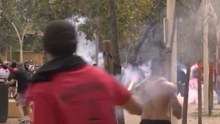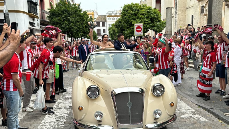 En el vídeo se puede ver cómo la pareja se monta en un flamante descapotable digno de película y, ni cortos ni perezosos, se abren paso entre la marea de hinchas del Athletic dando botes, brazos arriba y acompañando los cánticos como dos 'athleticzales' más. "Oe, oe, oe, oe...". ¡Vivan los novios! Algún tonto siempre hay en todos los lados y era inevitable que hubiese algún incidente, pero en general el comportamiento de los bilbaínos ha sido bastante respetuoso.