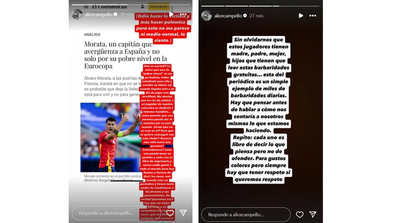 "Odio hacerme la víctima y hacer más polémica, pero esto no me parece ni medio normal, lo siento. ¿Esto es normal? Lo único que veo de pobre nivel es ser periodista, haber estudiado para ello y escribir un titular así cuando España está a un día de jugar una semifinal. Me alucina que en vez de animar a un jugador os dediquéis a intentar hundirlo... ¿Cómo pensáis que una persona puede dar el máximo por su país cuando siente que no se cree en él? ¿Qué se quiere conseguir con el titular? ¿Generar más odio hacia una persona? Enhorabuena, cada uno puede escribir su opinión y cada uno es libre de expresarla y nunca nadie gusta a todo el mundo, pero hay formas y formas de decir las cosas, más aún cuando eres de un periódico y tienes tanto poder de condicionar a los jóvenes. ¿De verdad queremos esto?", escribió la mujer de Morata en una primera historia de Instagram.