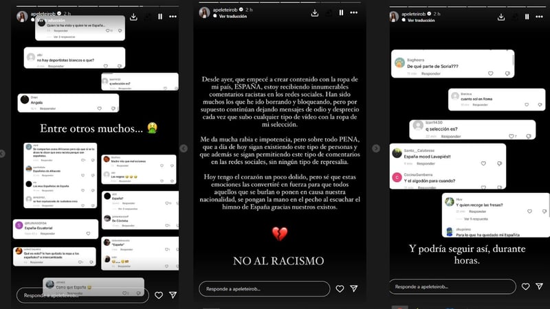 "Desde ayer, que empecé a crear contenido con la ropa de mi país, ESPAÑA, estoy recibiendo innumerables comentarios racistas en las redes sociales. Han sido muchos los que he ido borrando y bloqueando, pero por supuesto continúan dejando mensajes de odio y desprecio cada vez que subo cualquier tipo de vídeo con la ropa de mi selección", escribió Ana Peleteiro en una historia de Instagram.