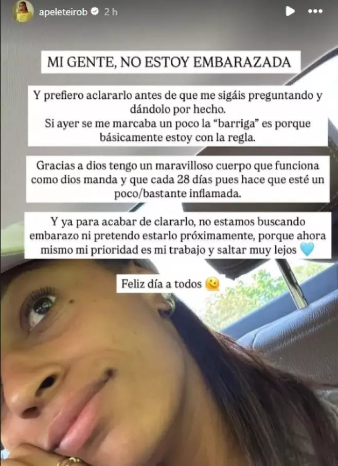 La atleta gallega, que fue madre de una niña en diciembre de 2022, ha terminado aclarando que "no estamos buscando embarazo ni pretendo estarlo próximamente porque ahora mismo mi prioridad es mi trabajo y saltar muy lejos. Feliz día a todos".