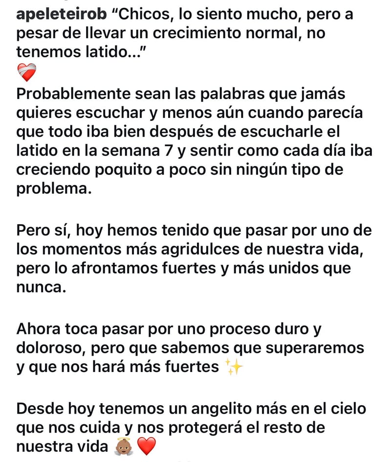 Pero sí, hoy hemos tenido que pasar por uno de los momentos más agridulces de nuestra vida, pero lo afrontamos fuertes y más unidos que nunca. Ahora toca pasar por uno proceso duro y doloroso, pero que sabemos que superaremos y que nos hará más fuertes. Desde hoy tenemos un angelito más en el cielo que nos cuida y nos protegerá el resto de nuestra vida".