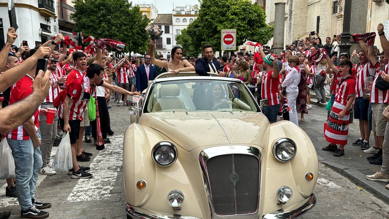 La marea de aficionados rojiblancos que se pudo ver el fin de semana en Sevilla hizo que la salida de los novios de la catedral sevillana fuese algo histórico. La pareja de recién casados abandonó el lugar subidos en un bonito descapotable clásico, pero escoltados por miles de aficionados del Athletic, que no dejaron de lanzar vítores a la feliz pareja.