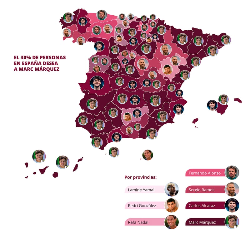 Marc Márquez arrasa en el ranking, coronándose como el deportista masculino más deseado de España, con un 30% de votos. El piloto, a pesar de tener notoriedad por todo el país, es cierto que saca más suspiros en la mitad occidental de Andalucía, Extremadura, Murcia, la Comunidad Valenciana y Cataluña. Carlos Alcaraz mantiene las distancias con el de Cervera, aunque saca muy buena cifra con un 22%. El tenista destaca particularmente en el norte de Extremadura, en el sur de la comunidad Valenciana y en algunas zonas de interior.