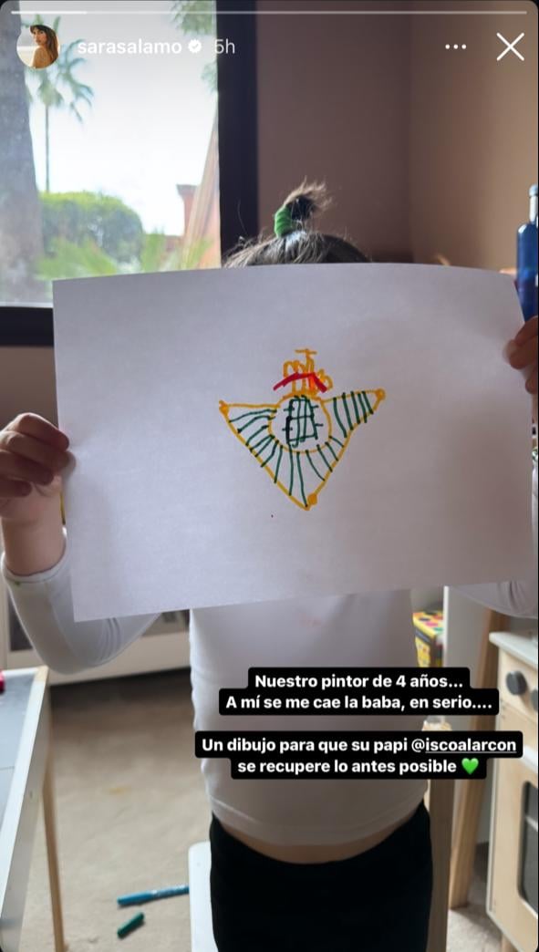 Al respecto también se ha referido el propio Isco, quien lamentó no poder ayudar al equipo en un tramo tan importante como el que viene, con la Conference League también por delante: "Una pena perderme este tramo importante de la temporada". La lamentación, eso sí, vino acompañada de una clara declaración de intenciones: "¡Ahora toca trabajar más que nunca para volver a tope!". Y es que el malagueño cuenta con una 'cura sorpresa' para tratar de conseguirlo, tal y como ha compartido en redes sociales su pareja la actriz Sara Sálamo, con la que contraerá matrimonio en breve tras algo más de seis años de relación. Se trata de un dibujo de su hijo pequeño "para que su papi se recupere lo antes posible".