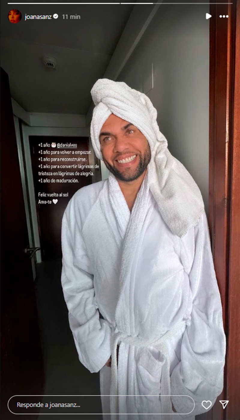 El mensaje es el siguiente: "+1 año. +1 año para volver a empezar. +1 año para reconstruirse. +1 año para convertir lágrimas de tristeza en lágrimas de alegría. +1 año de maduración", le ha dedicado la modelo con una foto en la que aparece el brasileño con una toalla y un albornoz en una posible habitación de un hotel. Unas palabras que ha rematado con un sentido “Feliz vuelta al sol. Amo-te”, junto con un corazón del mismo color que el outfit del jugador. Sanz ha tratado de olvidar lo que sucedió aquella madrugada del 30 de diciembre de 2022 y le ha dado una segunda oportunidad a Alves, decantándose por una felicitación atónita.