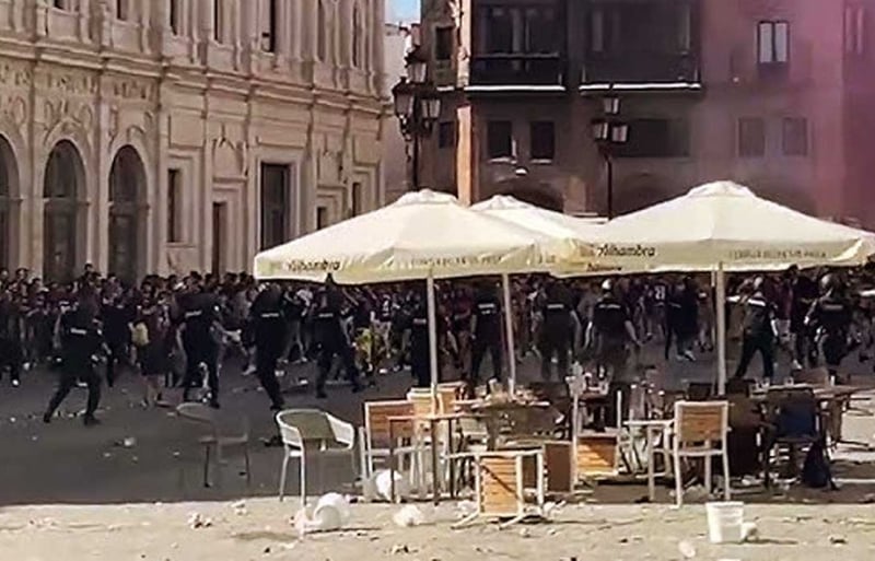 La Policía ha detallado que, en los prolegómenos del duelo por el título del torneo del K.O. entre el Real Madrid y el FC Barcelona, se produjeron una serie de incidentes en la céntrica Plaza de San Francisco de Sevilla, ubicada junto al Ayuntamiento de la ciudad hispalense, protagonizados por elementos de las dos facciones mencionadas, "hermanadas ideológicamente", que se enfrentaron violentamente a los integrantes de las Unidades de Intervención Policial (UIP) desplegadas en el lugar, de modo que una docena de esos agentes resultó herida de diversa consideración.