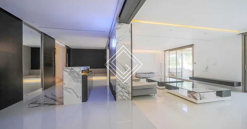 Esta mansión se distribuye en varias plantas conectadas por ascensor, entre las que se encuentran múltiples habitaciones y un baño con bañera de hidromasaje, y cuenta con un avanzado sistema de domótica que la convierte en un auténtico hogar inteligente. La casa también cuenta con una amplia zona para el ocio. Entre los elementos más destacados se encuentra una piscina interior climatizada con sistema de nado a contracorriente, además de un gimnasio completamente equipado y hasta de una sala de cine y sauna.