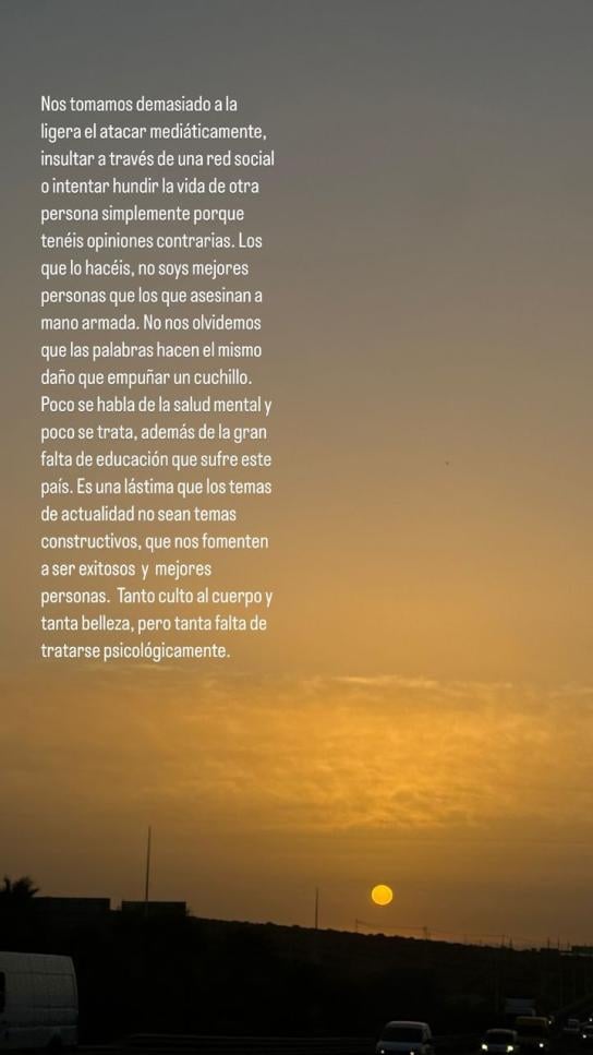 "Los que lo hacéis, no sois mejores personas que los que asesinan a mano armada. No nos olvidemos que las palabras hacen más daño que empuñar un cuchillo. Poco se habla de la salud mental y poco se trata, además de la gran falta de educación que sufre este país. Es una lástima que los temas de actualidad no sean temas constructivos, que nos fomenten a ser exitosos y mejores personas. Tanto culto al cuerpo y tanta belleza, pero tanta falta de tratarse psicológicamente", concluyó Sanz.