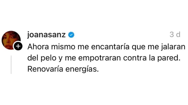 En una publicación en la plataforma Threads, un nuevo espacio propiedad de Mete y ubicado dentro de Instagram, Joana Sanz expresó: "Ahora mismo me encantaría que me jalaran del pelo y me empotraran contra la pared. Renovaría energías". Estas palabras, dadas las circunstancias relacionadas con la condena de Alves por violación, generaron un intenso debate sobre la sensibilidad y la idoneidad de sus comentarios.