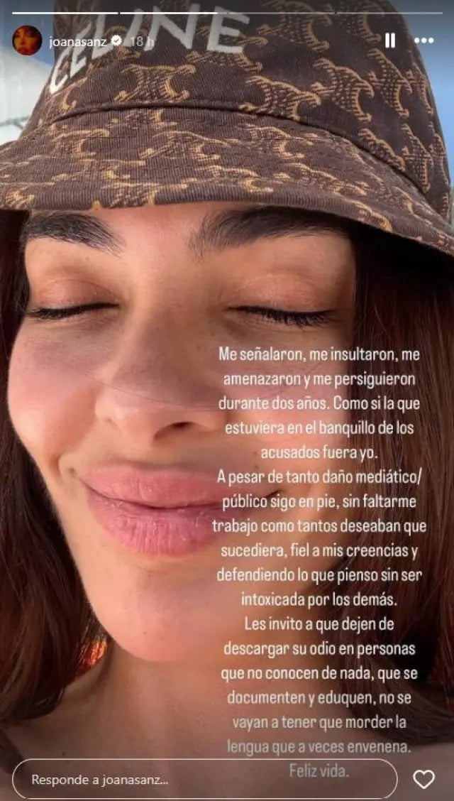 Joana Sanz ha mandado un mensaje para que todos los que le atacaron ahora "dejen de descargar su odio en personas que no conocen de nada, que se documenten y eduquen, no se vayan a tener que morder la lengua que a veces envenena". "Feliz vida", ha terminado diciendo para rematar su mensaje.