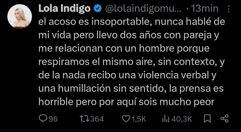 Ante la gran cantidad de críticas recibidas por Lola Índigo, la cantante publicó en X (antiguo Twitter) un mensaje que acabó borrando: "El acoso es insoportable, nunca hablé de mi vida, pero llevo dos años con pareja y me relacionan con un hombre porque respiramos el mismo aire, sin contexto, y de la nada recibo una violencia verbal y una humillación sin sentido, la prensa es horrible, pero por aquí sois mucho peor".