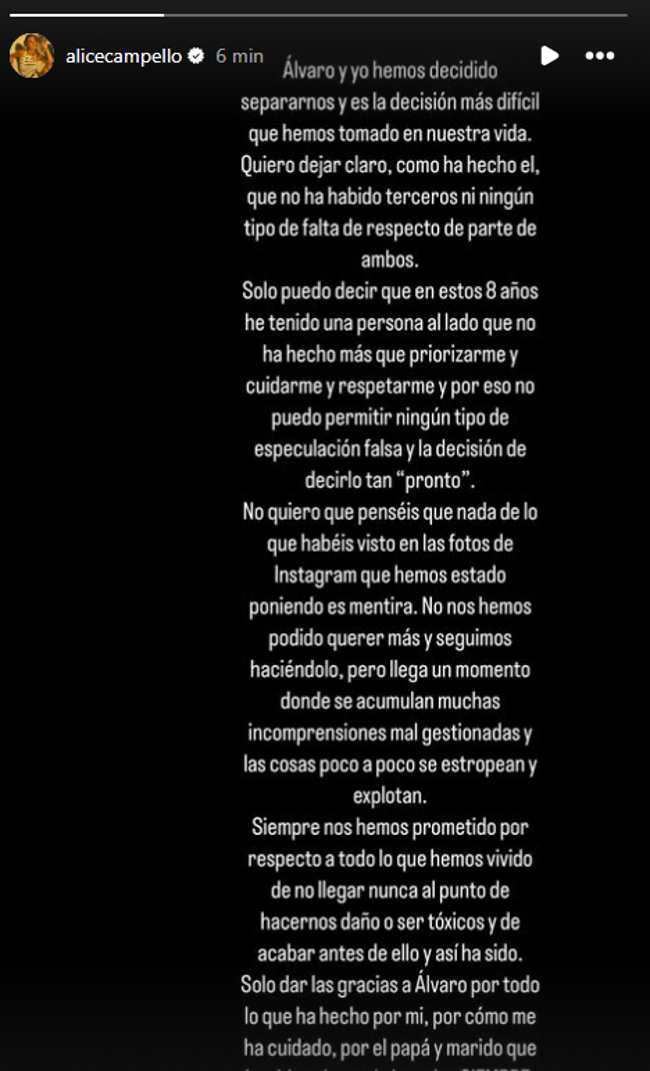 Pasan las horas y desde que este lunes pasado Álvaro Morata y Alice Campello decidieran poner fin a su relación amorosa, al menos de forma temporal, siguen llegando noticias en torno a la ruptura del jugador del Milán y su pareja italiana. La influencer y madre de sus cuatro hijos aseguró en su cuenta de Instagram que la decisión de separarse ha sido "la más difícil que hemos tomado en nuestra vida". En la misma línea, Morata también quiso dejar claro que "tras un tiempo de reflexión, Alice y yo hemos tomado la decisión de separar nuestros caminos. Una relación maravillosa y de respeto recíproco donde nos hemos querido y ayudado el uno al otro muchísimo".