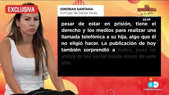 En relación con esta sorpresiva publicación en Instagram, se ha revelado que no fue bien recibida por la exesposa de Dani Alves, Dinorah, ni por su hija Victoria. Según el programa 'Fiesta', Leiras, uno de los colaboradores, compartió un comunicado escrito por los abogados de Dinorah en respuesta a la publicación. El comunicado revela que Dinorah está muy molesta por la situación y el rechazo que ha experimentado después de su apoyo público a Dani Alves.