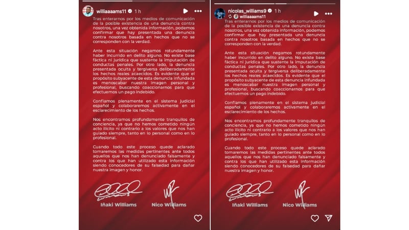 "Cuando todo este proceso quede aclarado, tomaremos las medidas pertinentes ante todos aquellos que nos han denunciado falsamente y contra los que han utilizado esta información siendo conocedores de su falsedad para dañar nuestra imagen y honor", acaba el comunicado de Nico e Iñaki Williams.