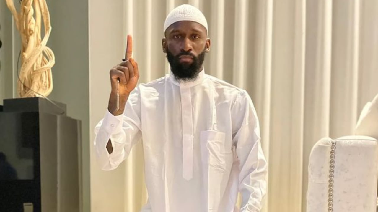 La foto que desató la polémica muestra a Rüdiger vestido con una túnica blanca árabe y arrodillado en un tapete de oración. Rüdiger mira a la cámara con un brazo ligeramente levantado y el dedo índice extendido.