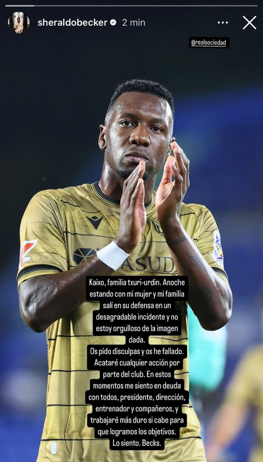 A perro flaco, todo son pulgas. Eso deben pensar Imanol Alguacil y la Real Sociedad, que siguen sin poder sumar demasiadas victorias en LaLiga EA Sports. Tras el encuentro ante el Real Valladolid, en el que los donostiarras no pudieron pasar del empate inicial, se ha conocido que uno de sus futbolistas, Sheraldo Becker, se ha visto involucrado en un desagradable incidente por el que ha tenido que pedir disculpas a través de sus redes sociales.