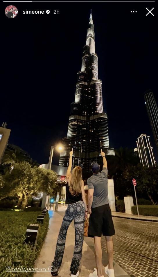 Carla Pereyra, mujer de Simeone, ha ido informando a través de Instagram de cómo transcurrió el vuelo desde Madrid hasta Dubai, enseñando también sus primeras horas en el país árabe. Por su parte, el técnico del conjunto rojiblanco también ha usado sus redes sociales para mostrar su viaje, en este caso subiendo una historia en Instagram en la que se le ve junto a su esposa señalando el edificio más alto de mundo, el Burj Khalifa.