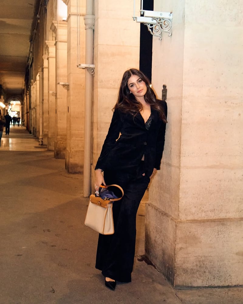Ya que estaba en París, Sira Martínez acudió a un acto de la lujosa marca Hermès, la cual es patrocinadora de Grand Palais. Para dicho acto, la joven vistió un elegante traje negro de terciopelo que acompañó con un bolso beige y unos tacones negros.