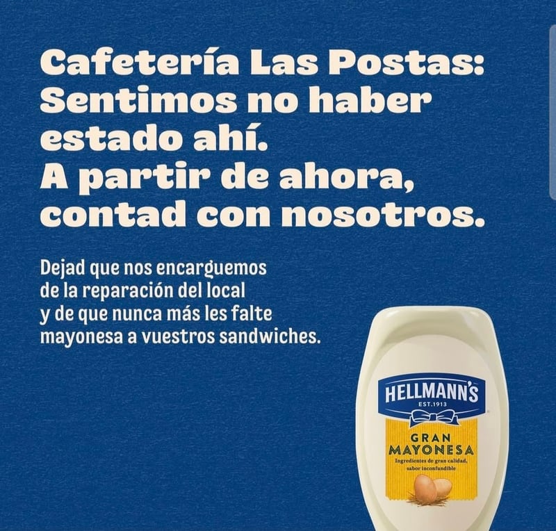 "Cafetería Las Postas: Sentimos no haber estado ahí. A partir de ahora, contad con nosotros. Dejad que nos encarguemos de la reparación del local y de que nunca más les falte mayonesa a vuestros sandwiches", ha publicado la marca de salsas en sus redes sociales, algo que seguro agradecerá el propietario del local.