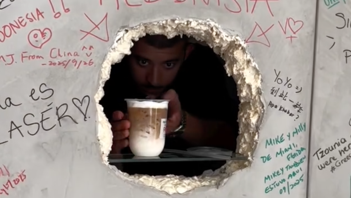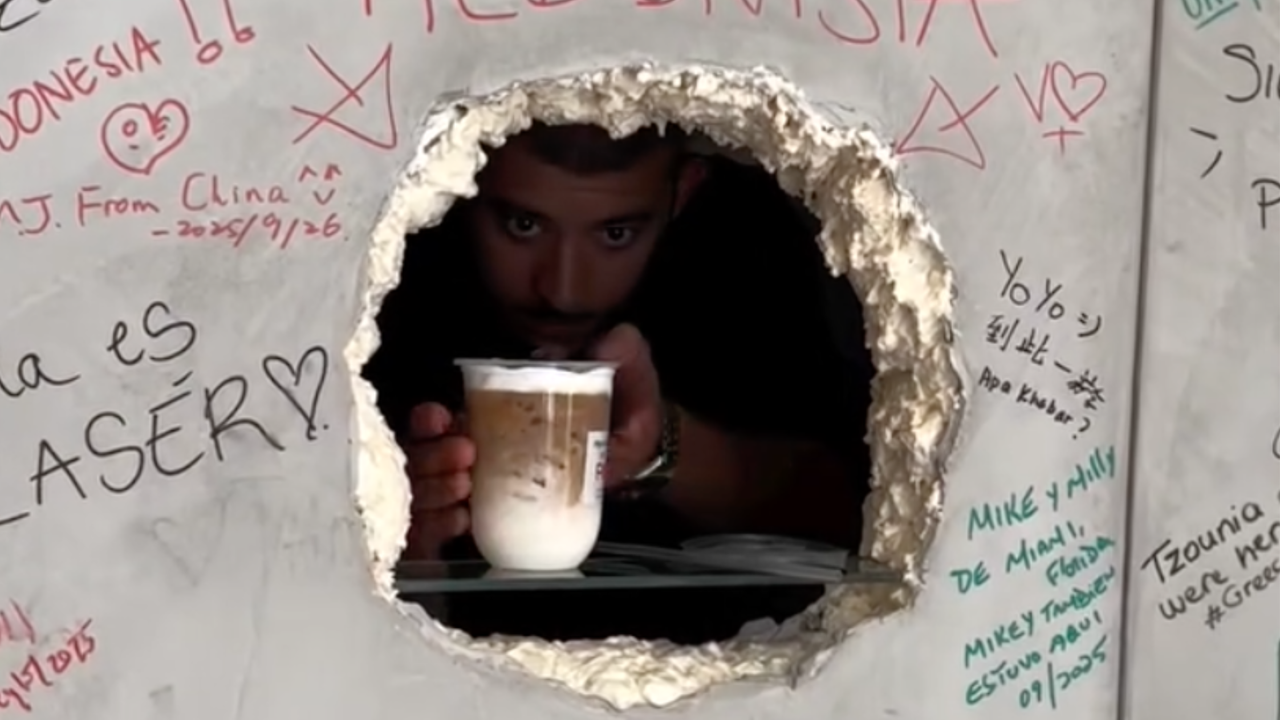 Si algo llama a la atención a los viandantes es que esta cafetería está detrás de un muro liso en el que se ven dos agujeros. Por uno, se realiza el pedido y por el otro se recogen los cafés. Una propuesta prácticamente colaborativa, que con el paso de los días se ha convertido en un mural de firmas y de recuerdos de las personas que han querido decorar su pared, recordando a las puertas de algunos baños públicos.