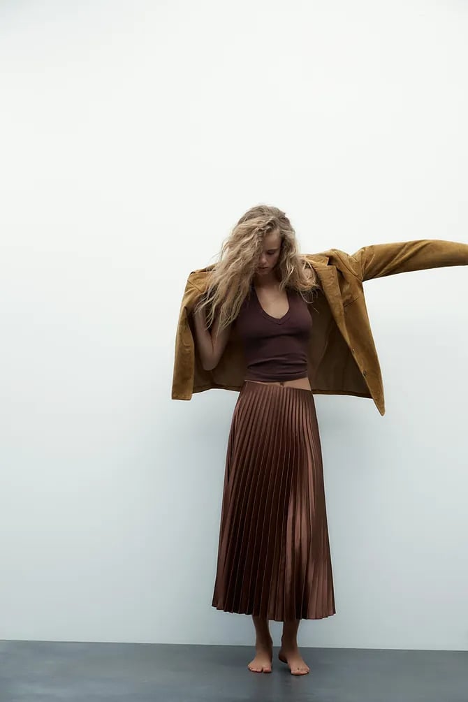 También en Zara hay una falda midi muy versátil y fácil de combinar, y es que la colección del gigante de Inditex puede ser tu gran aliada este otoño.