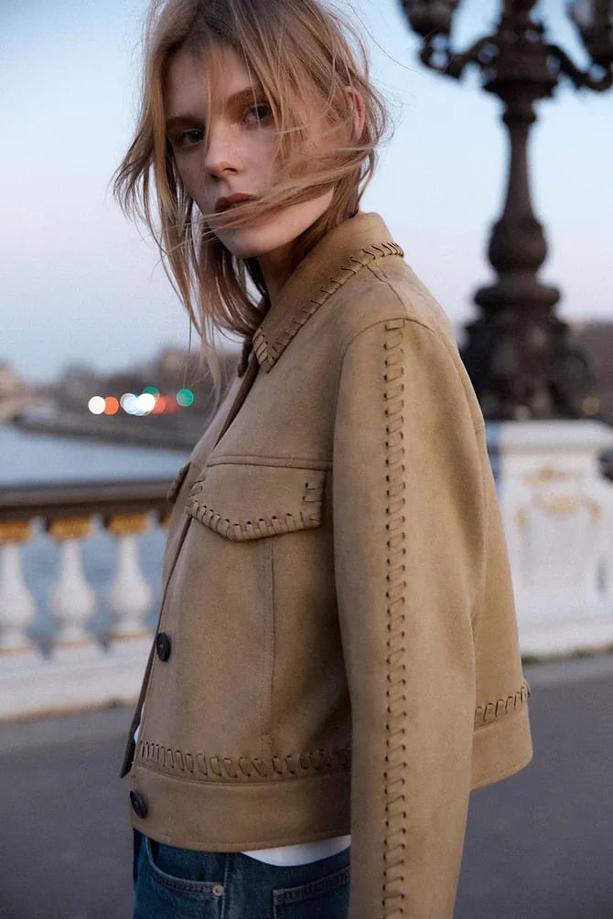 Siguiendo las tendencias comentadas anteriormente, Zara tiene disponible una cazadora con un marcado estilo ante que se puede convertir en algo básico esta temporada.