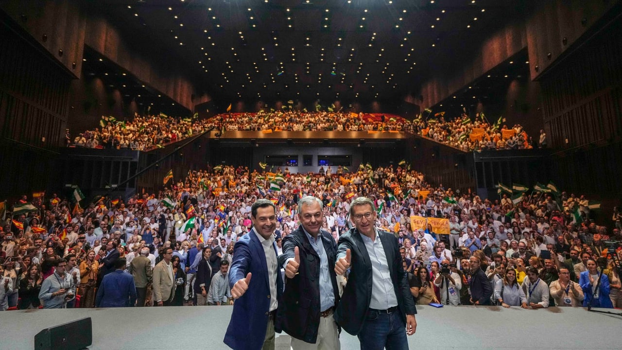 Juanma Moreno, José Luis Sanz y Alberto Núñez Feijóo, durante su mitin en el Cartuja Center.PP