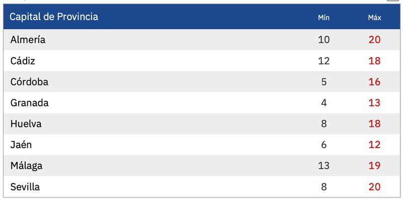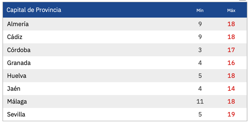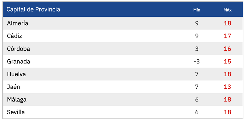 El jueves 27, la bajada de temperaturas se notará especialmente en Granada, llamando la atención los -3 grados que hará. También destaca Córdoba, donde las mínimas rondaran los 3 grados seguida de Málaga y Sevilla que tendrán mínimas de 6 grados.