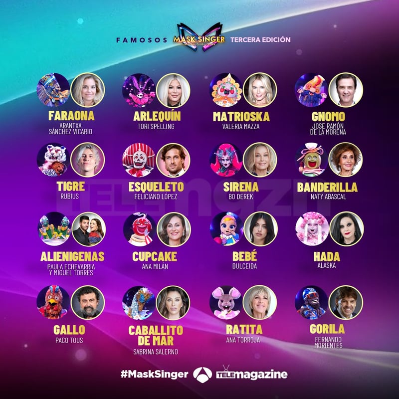 No obstante, una de las sorpresas la deparó la primera máscara conjunta, 'Alienígenas', que eran el ex de Real Madrid, Getafe CF o Málaga CF Miguel Torres y su pareja, la actriz y modelo Paula Echevarria. Tras el resto de máscaras se escondían personajes no menos inesperados como El Rubis, Valeria Mazza, Nati Abascal, Tori Spelling, Bo Derek, Dulceida, Alaska o Ana Milán.