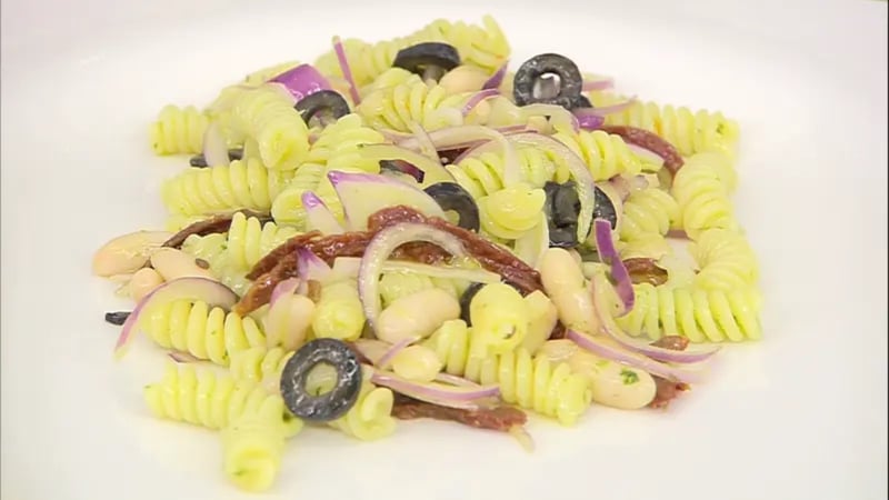 Una de las recetas más clásicas de ensalada de pasta que ha propuesto Karlos Arguiñano lleva alubias blancas, aceitunas negras, cebolla morada, anchoas y la propia pasta cocida, en su caso espirales. Todo emulsionado con una vinagreta. Otra versión podría ser con pechuga de pollo, aguacate y tomate cortado en dados.