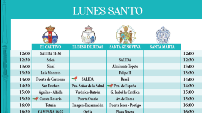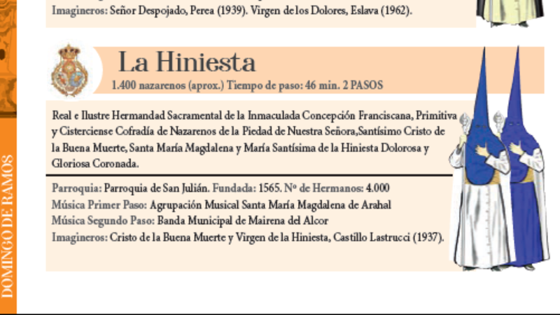 Desde hace más de un lustro, ‘Alcampo’ se encarga de que el sevillano sepa colocar en todo momento a todas y cada una de las cofradías que discurren por la ciudad. Y lo hace de una manera muy sencilla, permitiéndole llevar un pequeño programa de mano en forma de librillo. Una tradición que, cual brújula, concede al cofrade la posibilidad de conocer de primera mano la hora a la que el Buen Fin pasará bajo el arco del Postigo, el Valle pisará el barrio de El Arenal o el Calvario enfilará los adoquines de Murillo. Porque la presente Semana Santa está abarrotada de cambios en los recorridos y en los horarios, lo que supone verdaderamente una revolución. Así pues, sin el programa de mano será prácticamente imposible que el cofrade se oriente plenamente.