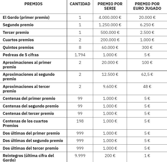 Los premios que se reparten en la Lotería de Navidad de 2022