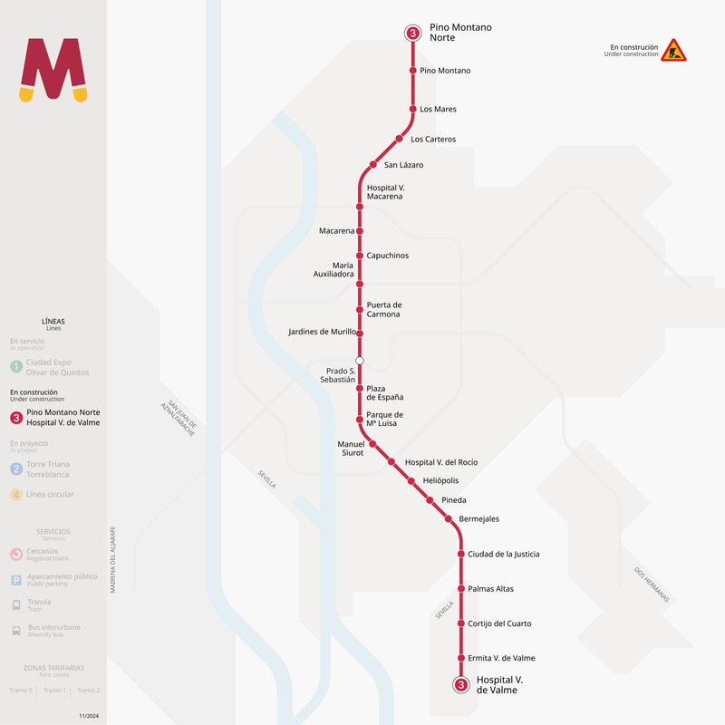 La propuesta provisional de la Junta de Andalucía para la línea 3 de Metro de Sevilla contempla 12 estaciones, las cuáles serían subterráneas desde la Borbolla y la Palmera hasta el barrio de Los Bermejales, y en superficie desde aquí hasta el Hospital del Valme. Una conexión que Sevilla está esperando, pero que parece que habrá más de una década para disfrutarlo.