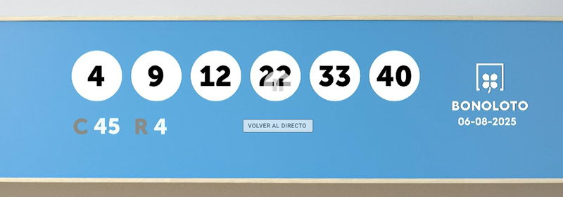 La Bonoloto ha repartido un nuevo premio. Los números agraciados en el sorteo de la Bonoloto de este miércoles 6 de agosto de 2025 son los siguientes: 4, 9, 12, 22, 33 y 40 . El número complementario es el 45 y el reintegro el 4