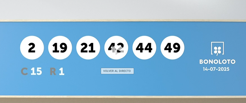 Los números agraciados en el sorteo de la Bonoloto del jueves 14 de julio de 2025 son los siguientes: 49, 21, 19, 44, 42, 2. El número complementario es el 15 y el reintegro el 1.