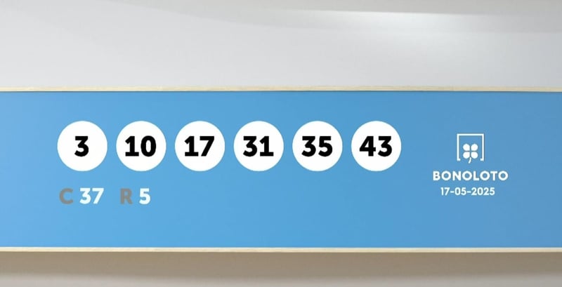 Los números agraciados en el sorteo de la Bonoloto del sábado 17 de mayo de 2025 son los siguientes: 3, 10, 17, 31, 35, 43. El número complementario es el 37 y el reintegro el 5. En el sorteo de ayer no hubo acertantes de primera categoría, pero sí que hubo tres de segunda categoría que se llevaron un bote de 51.492,26 euros. El bote de hoy es de 1.000.000 euros.