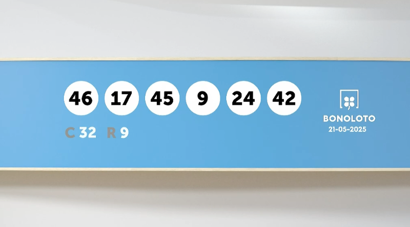 Los números agraciados en el sorteo de la Bonoloto del miércoles 21 de mayo de 2025 son los siguientes: 46, 17, 45, 9, 24 y 42. El número complementario es el 32 y el reintegro el 9. En el sorteo de ayer no hubo acertantes de primera categoría, pero sí que hubo dos acertantes de segunda categoría que se llevaron más de 70.000 euros cada uno. El bote de hoy es de 1.000.000 euros.