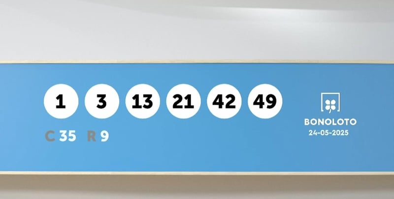 Los números agraciados en el sorteo de la Bonoloto del sábado 24 de mayo de 2025 son los siguientes: 1, 3, 13, 21, 42, 49. El número complementario es el 35 y el reintegro el 9. En el sorteo de ayer no hubo acertantes de primera ni de segunda categoría. El bote de hoy es de 1.200.000 euros.