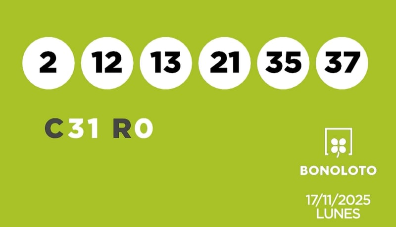La Bonoloto ha repartido un nuevo premio. Los números agraciados en el sorteo de la Bonoloto de este lunes 17 de noviembre de 2025 son los siguientes: 2, 13, 12, 21, 35, 37. El número complementario es el 31 y el reintegro el 0.