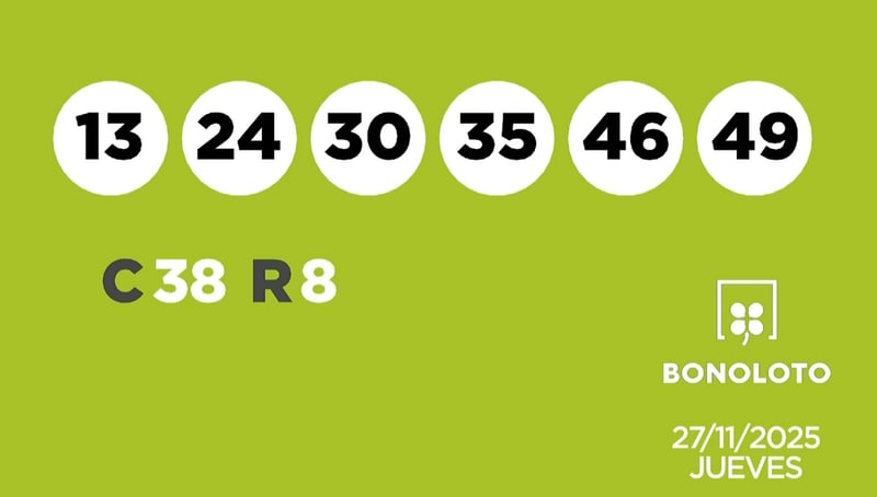 La Bonoloto ha repartido un nuevo premio. Los números agraciados en el sorteo de la Bonoloto de este jueves 27 de noviembre de 2025 son los siguientes: 13, 24, 30, 35, 46, 49. El número complementario es el 38 y el reintegro el 8.