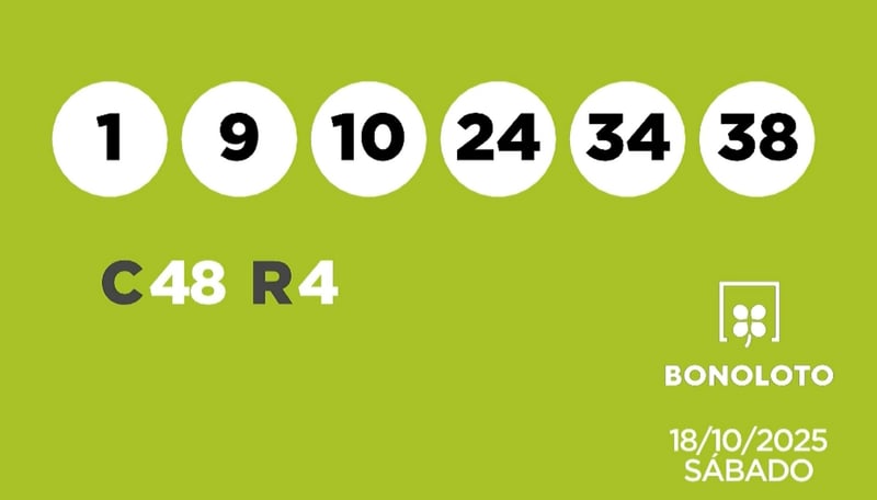 La Bonoloto ha repartido un nuevo premio. Los números agraciados en el sorteo de la Bonoloto de este sábado 18 de octubre de 2025 son los siguientes: 01, 09, 10, 24, 34, 38. El número complementario es el 48 y el reintegro el 04.