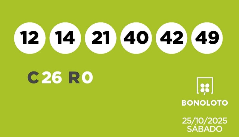 La Bonoloto ha repartido un nuevo premio. Los números agraciados en el sorteo de la Bonoloto de este sábado 25 de octubre de 2025 son los siguientes: 12, 14, 21, 40, 42, 49. El número complementario es el 26 y el reintegro el 0.