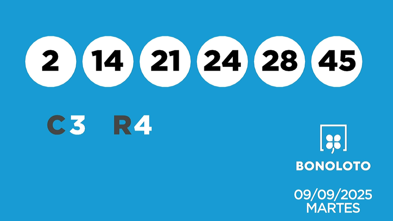 La Bonoloto ha repartido un nuevo premio. Los números agraciados en el sorteo de la Bonoloto de este martes 9 de septiembre de 2025 son los siguientes: 2, 14, 21, 24, 28 y 45 . El número complementario es el 3 y el reintegro el 4.