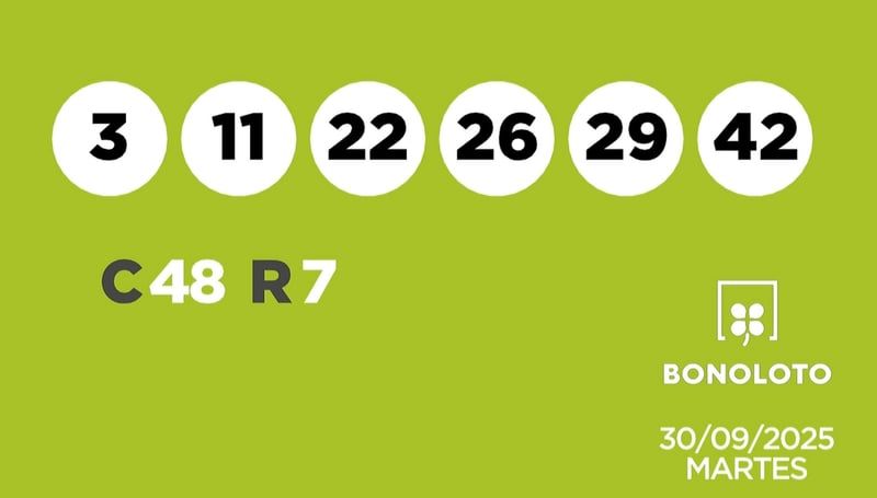 La Bonoloto ha repartido un nuevo premio. Los números agraciados en el sorteo de la Bonoloto de este martes 30 de septiembre de 2025 son los siguientes: 03, 11, 22, 26, 29, 42. El número complementario es el 48 y el reintegro el 7.