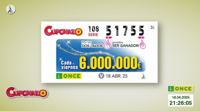 El sorteo del Cupón Diario de la ONCE correspondiente al viernes 18 de abril de 2025, que tuvo como número premiado el 51755, con la serie correspondiente al 108. Todos los resultados al completo, tanto de hoy como de fechas anteriores, los podrás ver en la web de ESTADIO Deportivo, siendo recomendable su comprobación también en los canales oficiales de la ONCE.