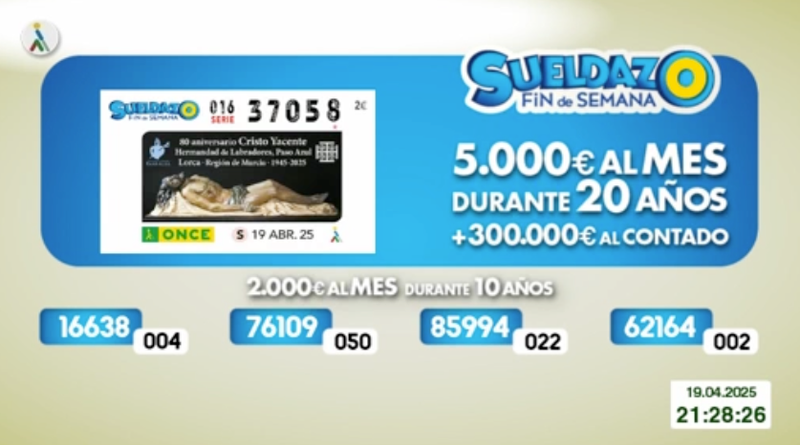 El sorteo del Cupón Diario de la ONCE correspondiente al sábado 19 de abril de 2025 se convirtió en algo único para la persona o personas que tenían en su poder el cupón con el número premiado, que al ser sábado era especial, puesto correspondía al del Sueldazo de la Once. Todos resultados al completo, tanto de este sábado como de días anteriores, los podrás ver en la web de ESTADIO Deportivo, siendo recomendable su comprobación también en los canales oficiales de la ONCE. El Sueldazo del fin de semana tiene unos premios distintos a los del Cupón Diario. La primera extracción se lleva 5.000 al mes durante 20 años y un premio de 300.000 euros al contado, mientras que las otras cuatro ganan un sueldo de 2.000 euros al mes durante 10 años.