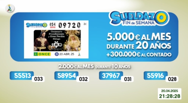 El sorteo del Cupón Diario de la ONCE correspondiente al domingo 20 de abril de 2025 se convirtió en algo único para la persona o personas que tenían en su poder el cupón con el número premiado, que al ser sábado era especial, puesto correspondía al del Sueldazo de la Once. Todos resultados al completo, tanto de este sábado como de días anteriores, los podrás ver en la web de ESTADIO Deportivo, siendo recomendable su comprobación también en los canales oficiales de la ONCE. El Sueldazo del fin de semana tiene unos premios distintos a los del Cupón Diario. La primera extracción se lleva 5.000 al mes durante 20 años y un premio de 300.000 euros al contado, mientras que las otras cuatro ganan un sueldo de 2.000 euros al mes durante 10 años.