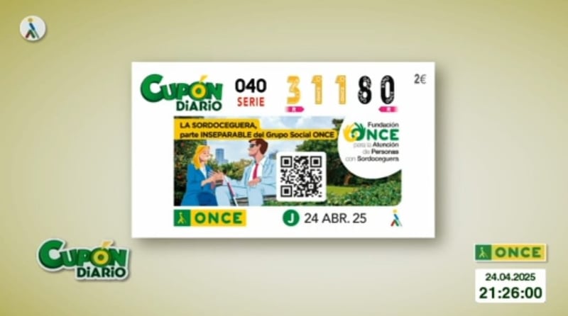 El sorteo del Cupón Diario de la ONCE correspondiente al jueves 24 de abril de 2025, que tuvo como número premiado el 31.180, con la serie correspondiente al 040. Todos los resultados al completo, tanto de hoy como de fechas anteriores, los podrás ver en la web de ESTADIO Deportivo, siendo recomendable su comprobación también en los canales oficiales de la ONCE.