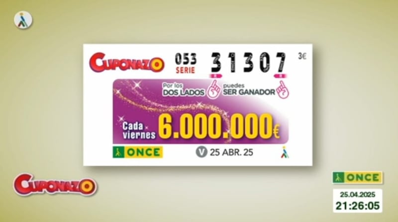 El sorteo del Cuponazo de la ONCE correspondiente al viernes 25 de abril de 2025, que tuvo como número premiado el 31.307, con la serie correspondiente al 053. Todos los resultados al completo, tanto de hoy como de fechas anteriores, los podrás ver en la web de ESTADIO Deportivo, siendo recomendable su comprobación también en los canales oficiales de la ONCE.