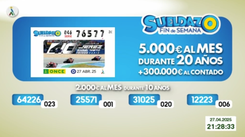 El sorteo del Cupón Diario de la ONCE correspondiente al domingo 27 de abril de 2025 se convirtió en algo único para la persona o personas que tenían en su poder el cupón con el número premiado, que al ser sábado era especial, puesto correspondía al del Sueldazo de la Once. Todos resultados al completo, tanto de este sábado como de días anteriores, los podrás ver en la web de ESTADIO Deportivo, siendo recomendable su comprobación también en los canales oficiales de la ONCE. El Sueldazo del fin de semana tiene unos premios distintos a los del Cupón Diario. La primera extracción se lleva 5.000 al mes durante 20 años y un premio de 300.000 euros al contado, mientras que las otras cuatro ganan un sueldo de 2.000 euros al mes durante 10 años.